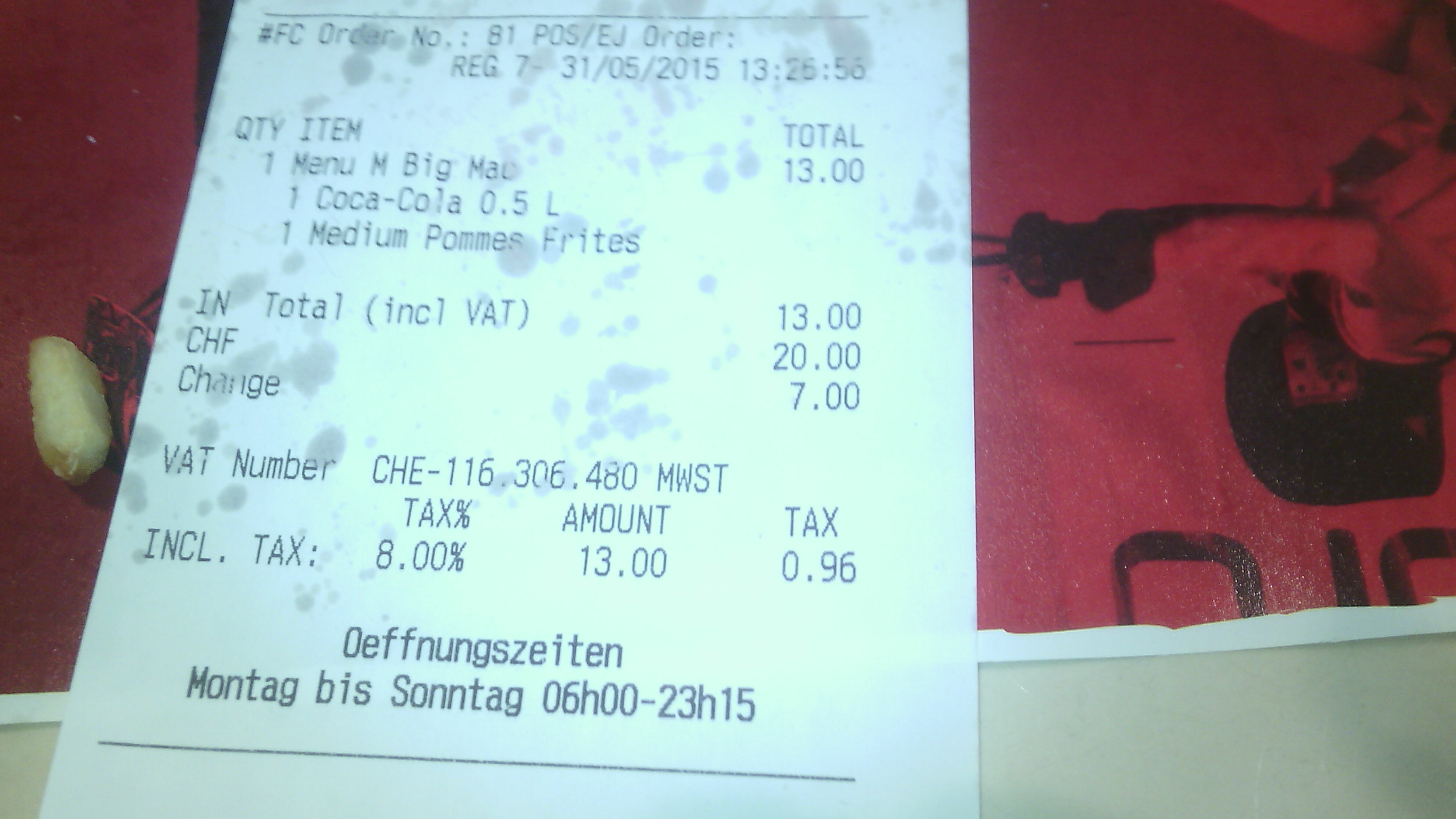 El ardor de estómago estaba en aumento, y como si de una sirena paliadora de dolores se tratara ví a esa maravillosa persona: Ronald Mcdonald. Compré un Mcmenú, y he de decir que aunque me lo esperaba, aun así me sorprendió. 13 Francos ! (Que son prácticamente 13 euros).