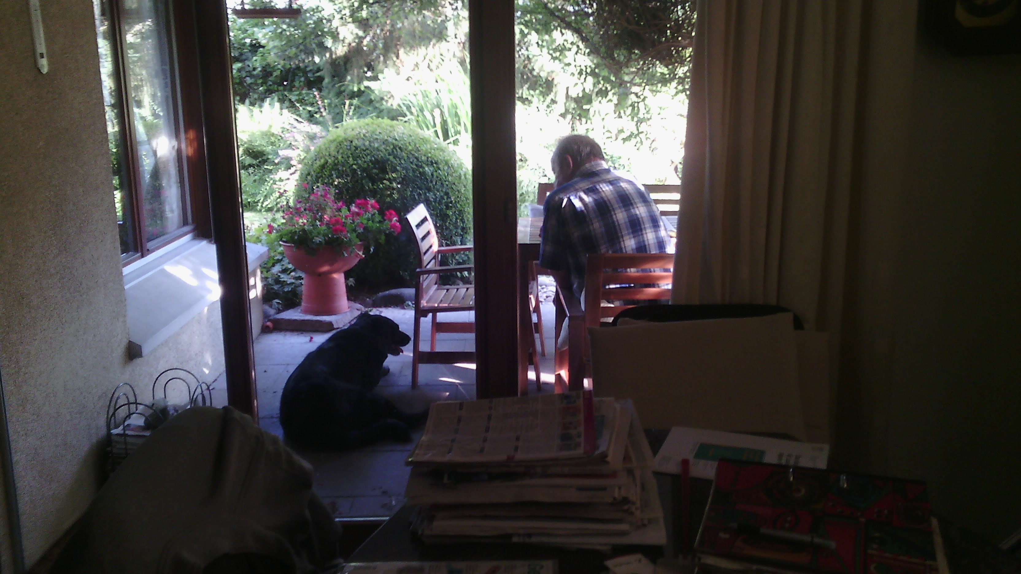 ¿Que qué es esto? Este es Roman Spiess, el abuelo con el que vivo, y ¿qué está haciendo? Estar sentado, fumar en pipa, y pensar (En qué piensa eso no puedo saberlo). Pues amigos esto es lo que hace ABSOLUTAMENTE TODAS LAS TARDES, desde que acaba de cenar (7:30 h) hasta que se va el sol, (21:30 h). Nada, ni un mísero libro, ni su móvil ni nada, se queda en el porche fumando y mirando al infinito (Que por cierto es algo jodidamente precioso en Suiza). Quizás realmente aprecie el paisaje como aquel que aprecia un cuadro y puede estar horas mirándolo. Pero esto es todo lo que hace, la verdad es que sigue siendo sorprendente, aunque supongo que lo que me sorprende aquí es la persona en sí, ya que aquí sí que no puedo afirmar que todos los suizos mayores se quedan fumando y mirando al paisaje durante horas y horas de sus vidas.(Aún)